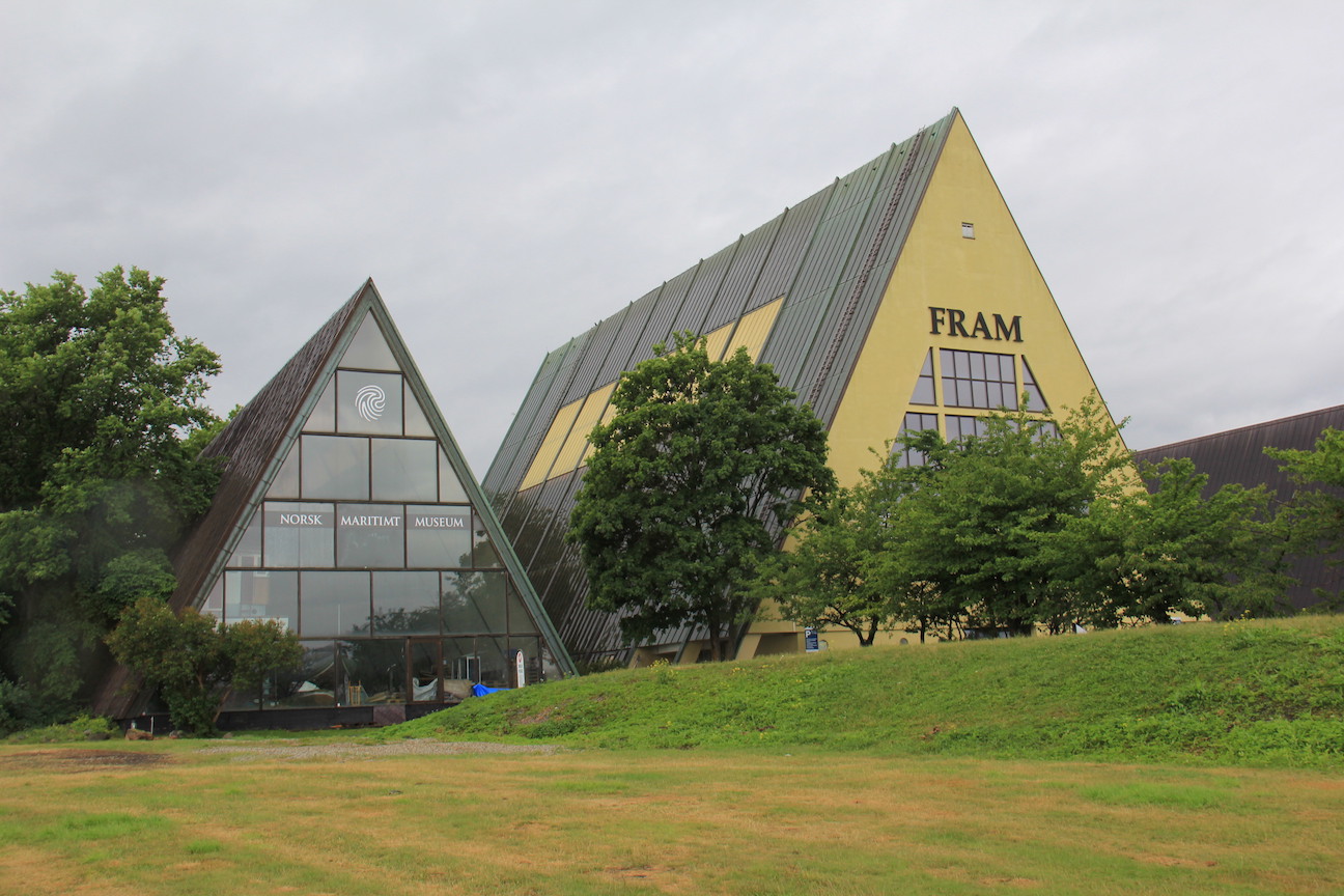 We visited the Fram Museum, dedicated to Norwegian polar expeditions and containing the actual vessel Fram, the first ship specifically designed for polar exploration and used by the famous Norwegian explorers Fridtjof Nansen, Roald Amundsen, and Otto Sverdrup. It was difficult to get good photos inside the museum, but here's the Fram in its display ...